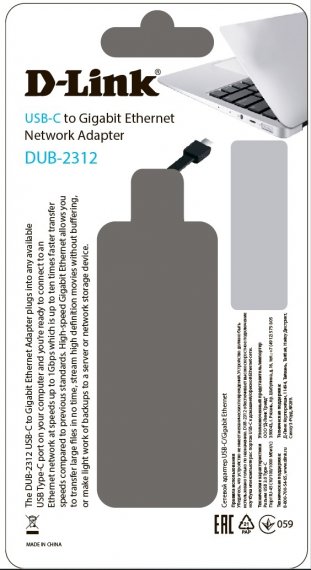 Сетевой адаптер DUB-2312 обеспечивает подключение Gigabit Ethernet для настольных и портативных компьютеров. Просто подключите адаптер к порту USB Type-C компьютера, после чего можно подключать коммутатор или маршрутизатор по Ethernet-кабелю.
