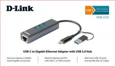 Сетевой адаптер DUB-2332 обеспечивает подключение Gigabit Ethernet для настольных и портативных компьютеров. Просто подключите адаптер к порту USB Type-C компьютера, после чего можно подключать коммутатор или маршрутизатор по Ethernet-кабелю. Если компьютер не оснащен портом USB Type-C, то переходник-адаптер, подключаемый к порту USB 3.0 Type-A компьютера, позволит воспользоваться интерфейсом USB Type-C. Благодаря трем портам USB 3.0, позволяющим подключать периферийные USB-устройства, DUB-2332 также может выполнять функции концентратора.