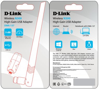 Адаптер DWA-137 предоставляет возможность использования беспроводного подключения в труднодоступных местах. Съемная всенаправленная антенна с коэффициентом усиления 5 dBi, которой оснащен адаптер, повышает качество приема сигнала. С помощью DWA-137 можно подключаться к беспроводной сети на большем удалении от маршрутизатора или точки доступа, чем при использовании обычного беспроводного адаптера. Возможность вращения антенны позволяет устранить зоны с низким уровнем сигнала и улучшить качество приема с помощью точной настройки положения антенны в пространстве. Использование данного адаптера совместно с беспроводным маршрутизатором Wireless N обеспечивает высокую производительность и позволяет оставаться на связи в любой точке дома. DWA-137 является обратно совместимым с устройствами 802.11g1.